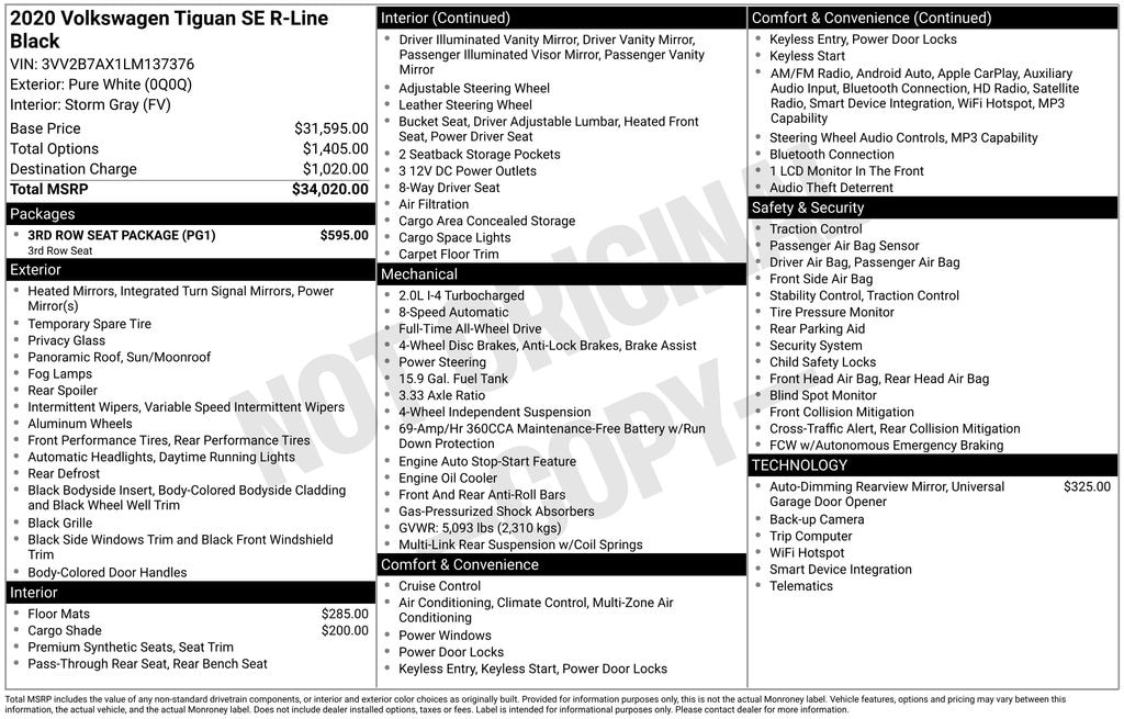Experience the perfect blend of performance, technology, and versatility with the 2020 Volkswagen Tiguan 2.0T SE R-Line Black 4Motion. Visit our showroom today and let us demonstrate how this remarkable SUV can enhance your driving experience.
