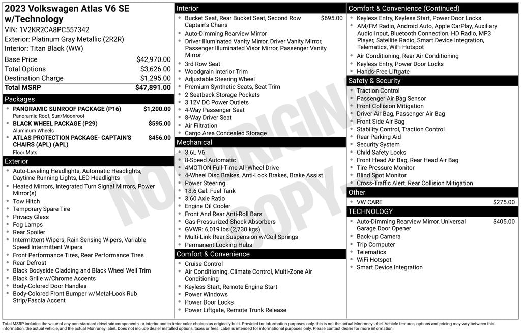 Experience the exceptional craftsmanship, advanced technology, and uncompromising performance of the 2023 Volkswagen Atlas 3.6L V6 SE w/Technology. Visit our showroom today and let us demonstrate how this remarkable SUV can enhance your driving experience. We're confident you'll be impressed by its capabilities and eager to make it your own.